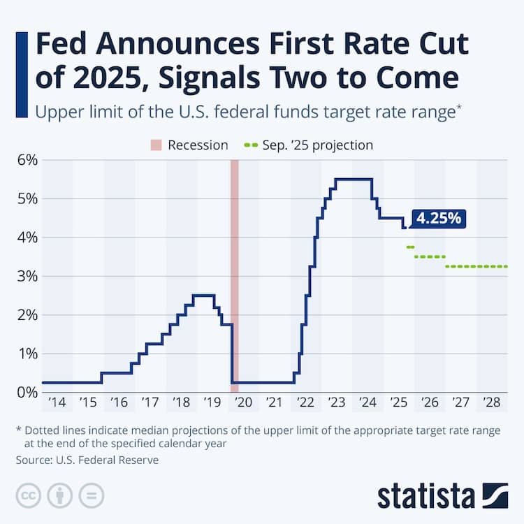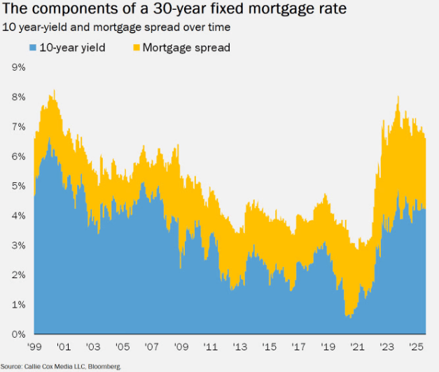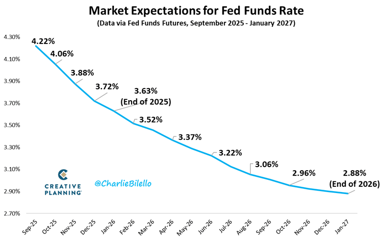 🎙️ Before we dive in, did you catch this week's podcast? 5 Favorite Investing Charts (Sept. 2025)#1 – The Fed (Finally) Resumed Cutting Rates Last month, the Federal Reserve followed through on its long-anticipated decision to cut rates by 0.25%. The Fed cited a weakening employment picture (more on that in a moment) as the main reason for the move. Officials also acknowledged concern over the recent uptick in inflation (which I'll also address shortly), but softer employment data appears to have carried more weight in driving the decision. #2 – Unemployment Is Rising as Job Openings Decline Coming out of the pandemic, job openings far outpaced job seekers with nearly two openings for every unemployed person. As shown in the chart below, while unemployment has ticked up slightly in recent years, the more meaningful change has been the sharp decline in job openings. For context, the current unemployment rate stands at 4.3%, still well below the long-term average of 5.6%. So, while not yet alarming, it’s clearly on the Fed’s radar. #3 – Inflation Is Climbing Again The other side of the Fed’s dual mandate—beyond employment—is price stability. After struggling to control inflation post-pandemic, the Fed managed to bring it largely back in line. However, inflation has started creeping up again and now sits at 2.9%; still below the long-term average but about 0.5% higher than a year ago. Given how costly it was to play catch-up during the pandemic, the Fed is keen to stay ahead of the curve this time. #4 – Where Do Interest Rates Go From Here? Most forecasts call for another 0.50% in total rate cuts (two quarter-point reductions) during the Fed’s final two meetings of 2025, followed by continued easing in 2026. That said, it’s worth remaining skeptical of long-term projections as there were similar expectations at the start of 2025, and we waited nine months before the Fed cut rates again. Ultimately, future rate decisions will depend on how inflation and employment data evolve in real time. #5 – What Rate Cuts Mean for Mortgage Rates A common misconception is that Fed rate cuts directly lower mortgage rates. While short-term rates do have some influence, mortgage rates more closely track the 10-year Treasury yield, as shown in the chart below. Complicating things further, the mortgage spread—the difference between mortgage rates and Treasuries—has widened due to factors like rate volatility, prepayment risk, declining loan volumes, and general market uncertainty. As a result, we may not see mortgage rates fall as quickly or as much as many homebuyers hope. Bottom LineAs these charts show, we’re in an unusual spot: Markets are hitting all-time highs, even as the consumer-level economic outlook looks increasingly uncertain. While that might sound concerning, you can build a plan to factor in nearly all forms of uncertainty. It never disappears; it just changes shape. And throughout history, markets have consistently rewarded disciplined, long-term investors who stay the course. With history as our guide (it's the only guide we truly have, by the way) we’d be wise to continue staying the course. 📚 What I've Been Reading