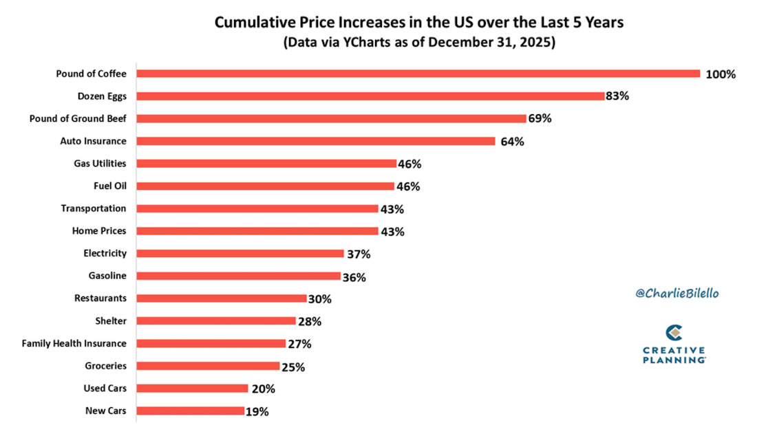 If you've been paying attention to inflation headlines, you'd think things are still spiraling. But inflation has been below 3% for two years now...not exactly the crisis narrative we keep hearing. What's even more interesting is what happened over the past year. Tariffs were expected to push prices higher. Profit margins were expected to shrink. The economy was supposed to slow down. Almost none of it played out the way most people assumed it would. That pattern is worth understanding, especially if it's influencing how you think about your money. *** Before we dive in, did you catch this week's podcast? 👇 Surprising Things Happen All the TimeDespite the fact that inflation has stayed below 3% for the last two years, it continues to be a popular topic of conversation and concern. That's understandable. Compared to the zero-interest-rate era of the 2010s, inflation has felt high, averaging 4.5% over the last five years. But you may be surprised to learn that, when we zoom out, this isn't far from the 3.8% average from 1960 to 2024. Of course, the doom-and-gloom media hasn't helped our perspective, and neither has our personal experience at the grocery store. As you can see below, the price increases of at least three grocery staples have been dramatic, nearly tripling our general inflation rate (or more) over the last five years. Because we see and feel these increases so frequently, they reinforce the idea that inflation remains out of control. But taken as a whole, grocery prices have risen in lockstep with general inflation, both up about 25% over the same period. That's certainly not fun, but it's not as out of line as we've been led to believe. I share this context as a backdrop for what's surprised me most about inflation (and a few other things) over the past year. Back in April, when tariffs were rolled out, it was a reasonable assumption that inflation would spike again. Higher producer costs—which tariffs cause—are generally passed along to consumers over time. Had that spike materialized, it would have been equally reasonable to expect a market decline similar to 2022, during peak inflation. Well, as you already know, neither of those expectations has come to fruition; at least not so far. Inflation has been stable, declining to 2.7% as of the most recent reading, and the stock market has risen dramatically since the initial tariff announcements. Beyond that, profit margins, which were also supposed to take a hit, are now at all-time highs. And real GDP growth in the third quarter came in at 4.4%, the highest since 2023. This combination of events was virtually unfathomable in April. Which begs the question: How was this outcome even possible? In short, the economy and the stock market are far more complicated than people like to think. Just as inflation doesn't inevitably result from a single policy decision, the economy and markets are driven by countless moving parts. Outcomes that feel inevitable and obvious often fail to materialize—at least not in the way, or on the timeline, we expect. So beyond embracing the reality that surprising outcomes (both good and bad) happen all the time, what else can we take away? It reinforces why we build long-term financial strategies using a very specific framework 👇 Purpose → Plan → Portfolio Your purpose and goals define the scope of your plan. Your plan then determines how your portfolio is constructed and allocated. Bottom LineNotice what’s missing from that process: headlines, forecasts, and real-time economic predictions. That omission is intentional. Your goals, combined with a rational understanding of history, are far more reliable inputs for building a durable financial plan than reacting to news cycles or trying to anticipate the next economic surprise. And once that plan is in place, your primary role is stick with it. That’s why you’ll continue to hear me emphasize “stay the course.” Not because surprises don’t happen, but because they do! And history shows that staying disciplined through them is one of the most powerful advantages long-term investors have. 📚 What I've Been Reading